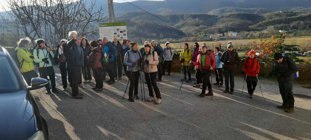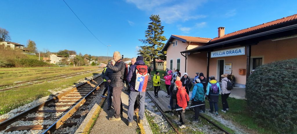 V mrzlem in vetrovnem četrtkovem jutru smo se hitro razporedili v avtomobile in se odpeljali na železniško postajo v Volčjo Drago. Točno ob uri je prisopihal vlak. Vožnja do Dornberka je trajala le nekaj minut. S postaje smo šli na sprehajalno in kolesarsko tematsko učno pot, ki povezuje vse občine v Vipavski dolini. Vodi od izvira v Vipavi do Mirna, nadaljuje pa se še na italijansko stran do izliva reke Soče. Celotna pot je dolga 46 kilometrov. Četrtkovi pohodniki smo, glede na našo zmogljivost, izbrali le del poti v dolžini osem kilometrov, od Dornberka do Volčje Drage. Pot so nam kazale usmerjevalne tablice na količkih z logotipom vidre. V Dornberku smo se usmerili na makadamsko stezo ob železniških tirih, jih kmalu prečkali, nato čez manjši mostiček in mimo razpadajočega vodnega stolpa, ki je nekoč služil za hlajenje parnih lokomotiv. Kmalu smo prispeli v Prvačino, v razloženem naselju, ki leži na sončni vzpetini nad reko Vipavo. Je tudi kraj z mnogimi znamenitostmi. Na ovinku za vojaškim pokopališčem iz prve svetovne vojne smo po manjšem, tudi edinem vzponu na pohodu, šli po znamenitem drevoredu platan na vzpetino starega vaškega jedra, kjer stoji cerkev sv. Andreja in hiša Aleksandrink.