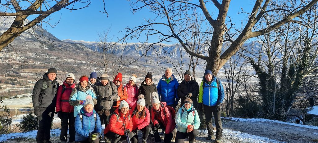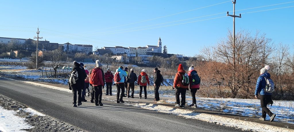 Po dveh prazničnih četrtkih je bilo za starim mlinom spet živahno. Na prvem letošnjem pohodu smo se zbrali, željni narave in družbe, četrtkovi pohodniki za dušo in srce. Prve jutranje besede so bile: »Srečno in zdravo leto 2026«. Jutro je bilo mrzlo, …. termometer je pokazal kar minus devet stopinj. Sneg je pobelil tudi našo dolino, tla so bila poledenela, rojeval se je lep dan. Zato je bilo potrebno izbrati vremenskim razmeram primerno pohodno pot. Odločili smo se, da korake usmerimo proti Vipavskemu Križu. Previdno smo se sprehodili po poledenelih ajdovskih ulicah. Hodili smo ob železniški progi, po kolovozni poti in skozi podhod pod avtocesto, po cesti proti Križu, ki je bila tudi delno poledenela. Kmalu se nam je odprl pogled na s soncem obsijan Čaven in Vipavski Križ pred nami. Čudovit je bil pogled na bele hribe Gore. V zgodovinski kraj na vrhu griča, Vipavski Križ, smo vstopili skozi obokan vhod. Kraj je prvič omenjen v 13. stoletju, bil je obrambna utrdba Goriških vrat. Kraj sodi med najlepše zgodovinske in kulturne spomenike v Sloveniji. Večina zgradb je spomeniško zaščitena. Najstarejši del naselja ima ozke ulice in trge, hiše so stisnjene v zavetje obzidja. Obdan je z vinogradi in sadovnjaki, lepi razgledi segajo po Vipavski dolini. V centru kraja je cerkev sv. Križa iz leta 1200 in kapucinski samostan sv. Frančiška Asiškega. Kraj je bil v zadnjih letih lepo obnovljen. Na pročeljih hiš smo si ogledali slike o življenju domačinov v preteklosti. Sprehodili smo se po ulicah in si ogledali jaslice na prostem, ki so že tradicija tega kraja v božičnem času. Razstavljene so pred hišami, na okenskih policah, stopnicah in v kotih ulic, vse delo pridnih domačinov. Na razgledni točki s pogledom na Čaven smo se postavili pred objektiv. Prijazna domačinka Iva nas je, glede na mrzel dan, postregla z okrepčilom. Vrnili smo se delno po isti, delno po drugi poti, po makadamskem in travnatem kolovozu. Čeprav je sonce že toplo grelo, ledenih zaplat ni omehčalo. Držale so jutranje besede. Srečno smo se vrnili in šli na kavico, ki nam je skupaj s sončnimi žarki v Baru Sonček pregnala mraz in pogrela dušo in srce.