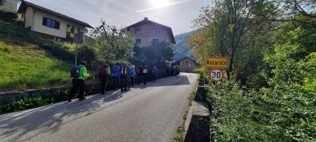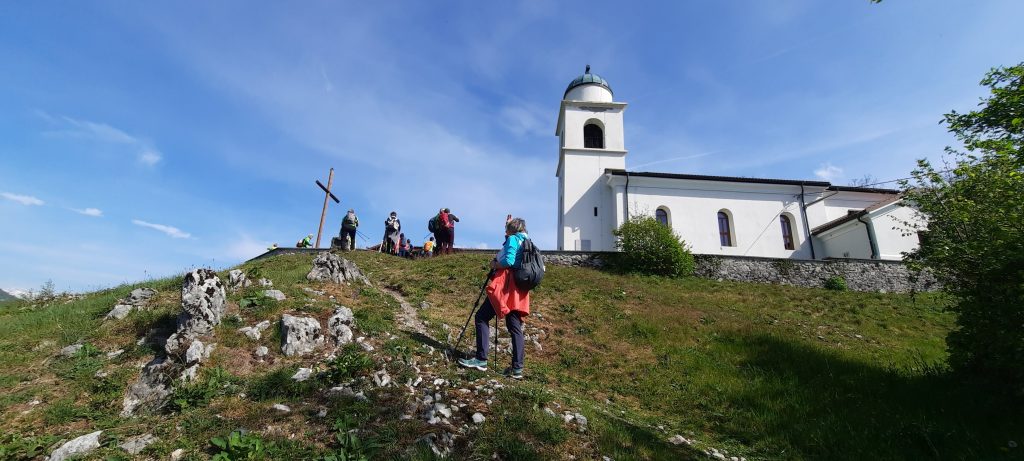 V dolino smo se vračali po krožni poti – po križevem potu. Pot  z vrha pelje za cerkvijo, mimo vojaških jarkov in kavern. Mengore so bile med prvo svetovno vojno 29 mesecev jedro avstro-ogrske obrambe in izpostavljene nenehnemu obstreljevanju italijanskega topništva. Ustavili smo se pod vrhom, v Muzeju na prostem Mengore. Tu se nahaja informativna tabla in spominska obeležja ter  vpisna skrinjica z žigom. Odtisnili smo ga v spominsko knjižico. Muzej je tudi del Poti miru od Alp do Jadrana.  Lepa uhojena  pot  po zelenem gozdu se je začela strmo spuščati. Olistana drevesa  so nudila prijetno senco in sveži zrak. Ob postankih in ugotavljanju pomena slik v kapelicah križevega pota smo pozabili na strmino in hitro prišli v dolino. Pot mimo spomenika NOB nas je pripeljala do avtomobilov. Vožnja proti domu, po cesti s pogledom na smaragdno barvo reke Soče, je bila prijetna in četrtkovim pohodnikom pobožala dušo in srce.
